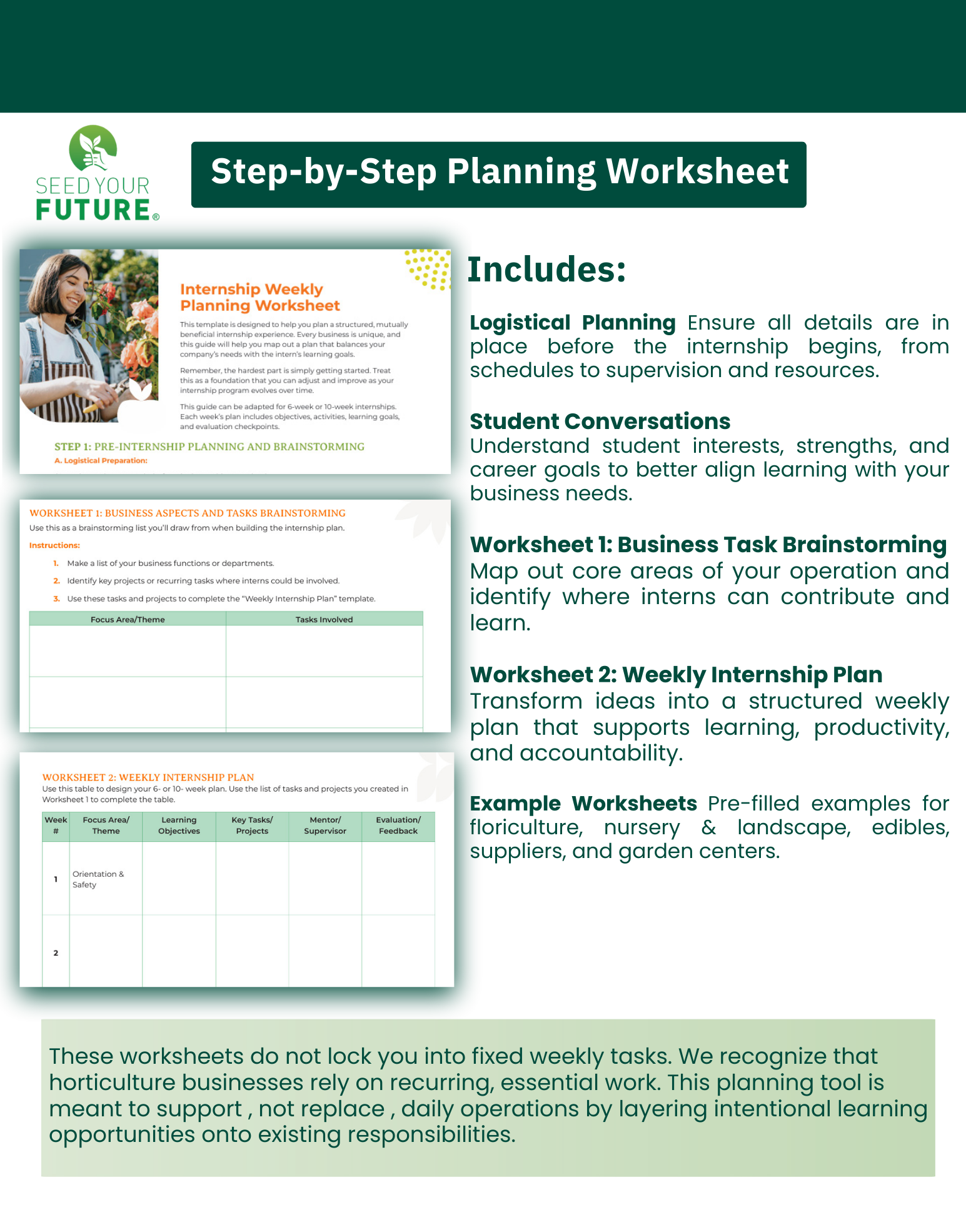 The Employer Handbook and webinar are available at no cost. With a recommended donation of $250, you gain full access to the complete suite of Employer Internship Worksheets and planning tools.