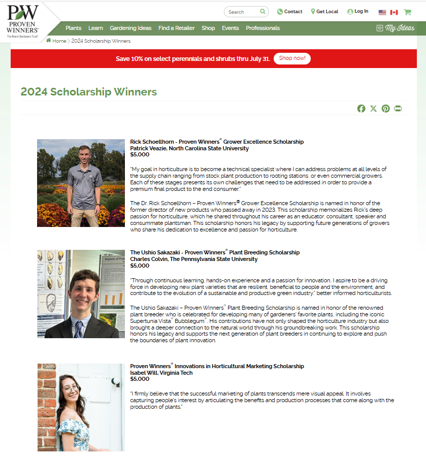 The Proven Winners scholarship program currently awards several different scholarships, including three, $5,000 scholarships to those studying at a four-year college or university, and up to five, $2,500 scholarships to those at a two-year community college, tech or vocational program.